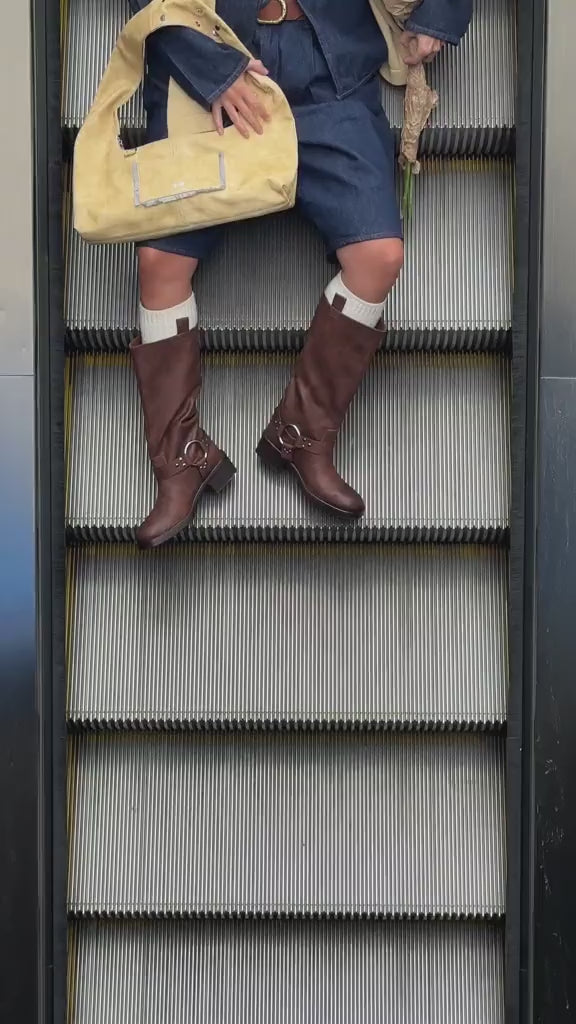 Mini split suede bowling bag. Top handle and detachable crossbody strap. Topstitched detail on the top. Interior zip pocket.
