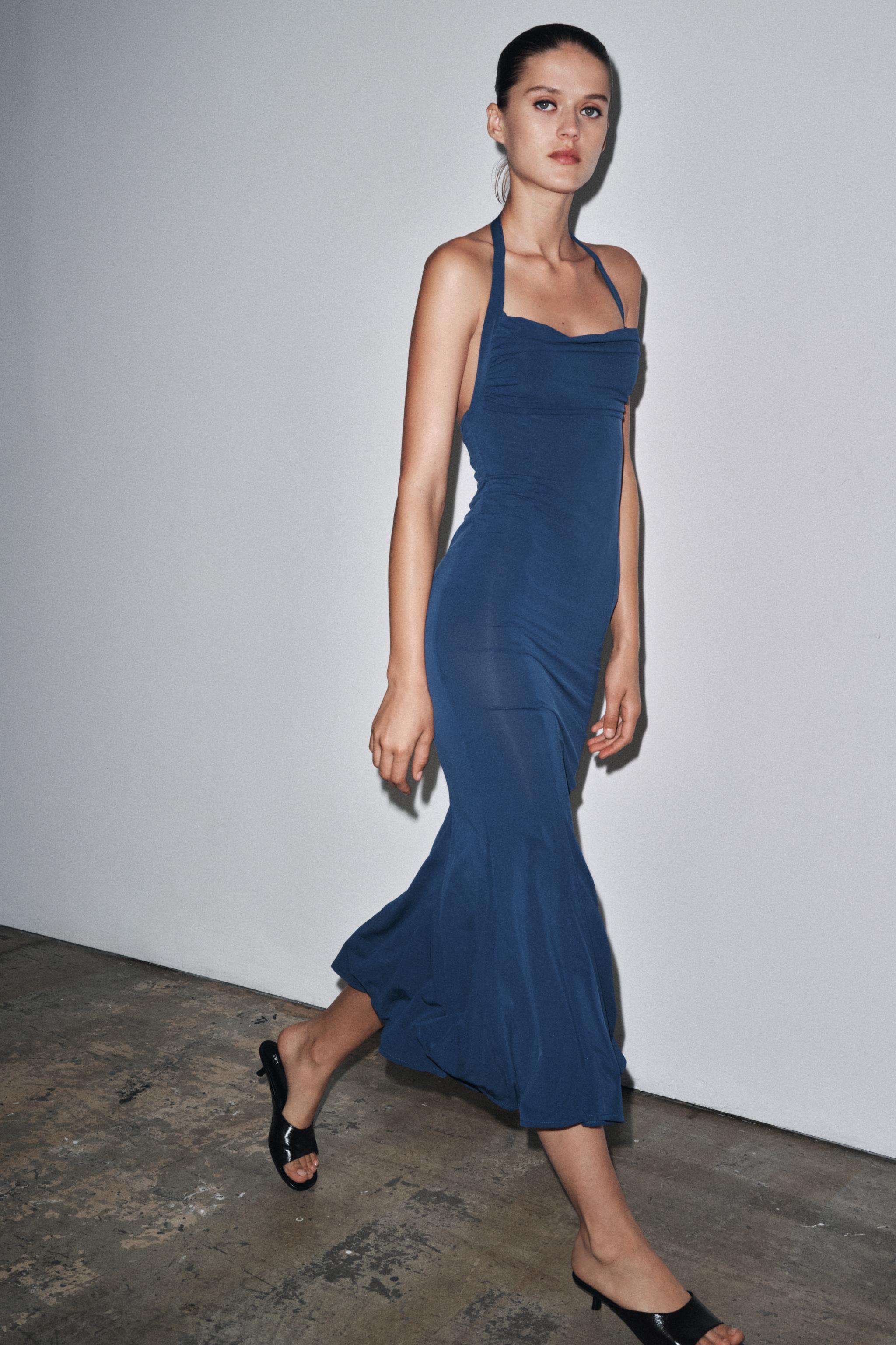 Flowing halter neck long dress. Open back. Flared hem.