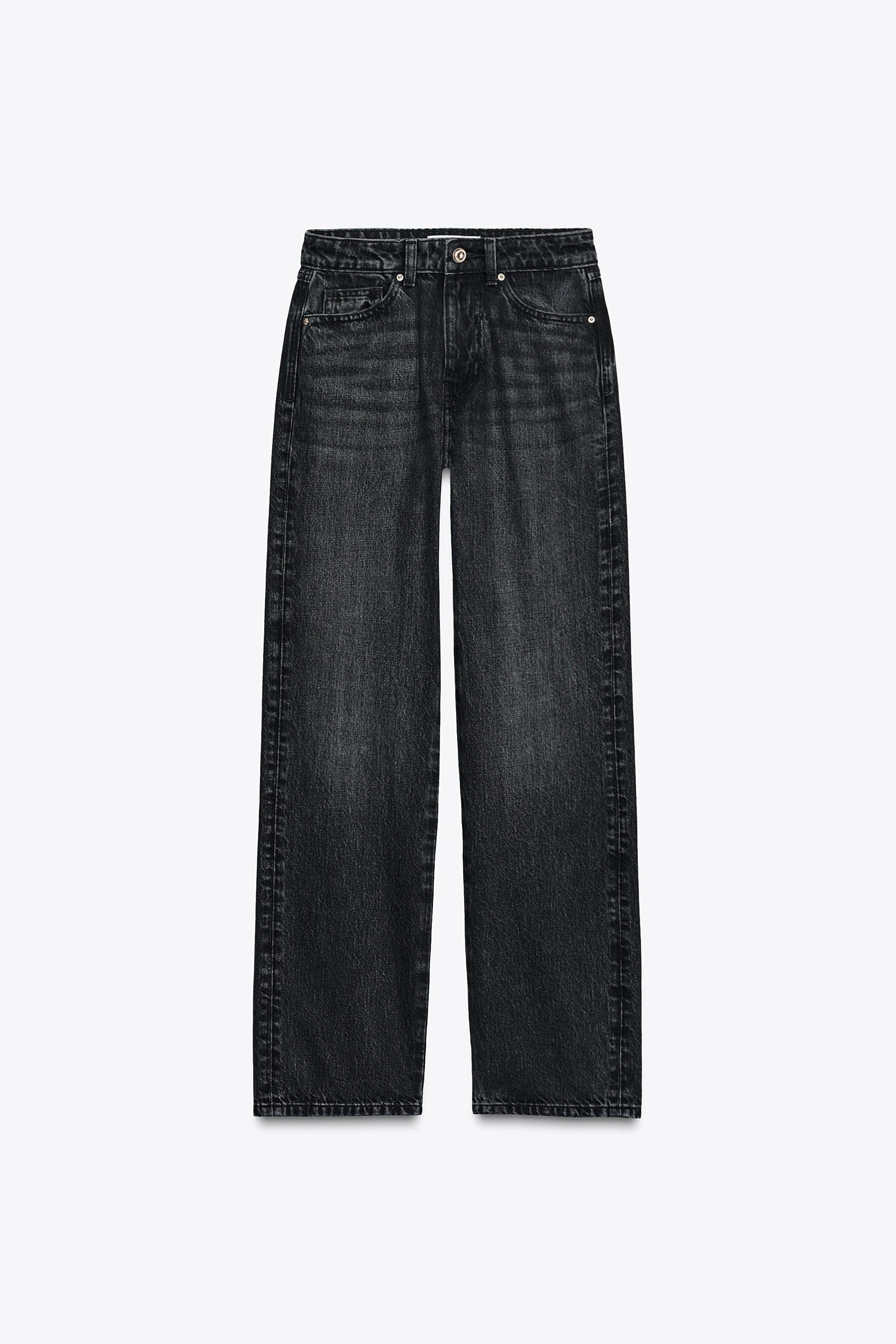 High-waist jeans with five pockets. Straight, long leg. Front zip and button fastening.