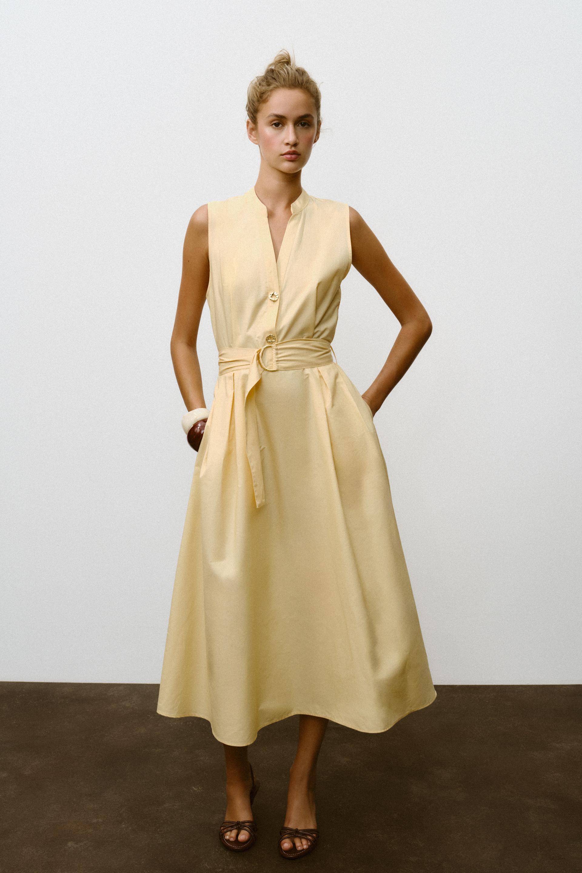Dress with a round neck and sleeveless design. Featuring dart detail at the waist and a belt. In-seam side pockets. Flared hem. Front fastening with gold buttons.