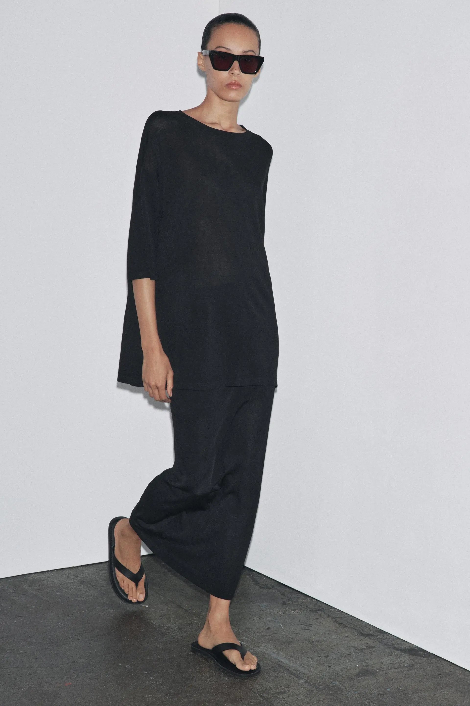 Round neck top with sleeves that finish below the elbow. Hem with side vents.