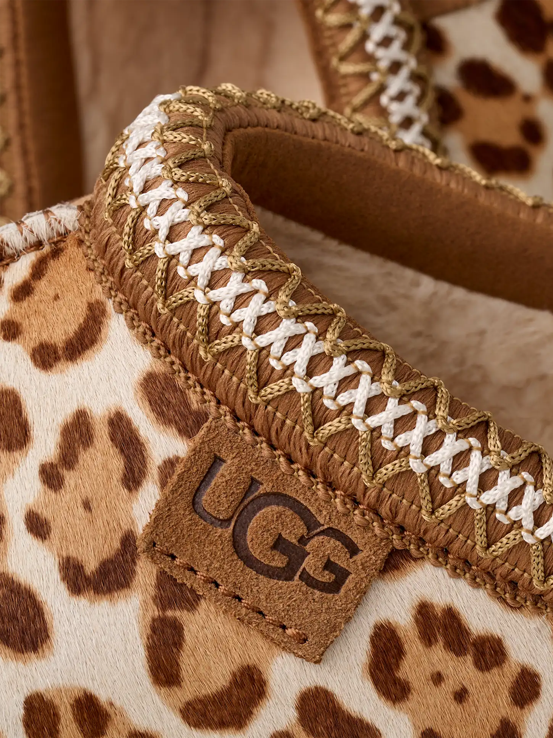 Plettet mønster, overdel i kalvehår, UGGbraid fremstillet af 100 % genanvendte polyesterfibre, trækstrop bagpå