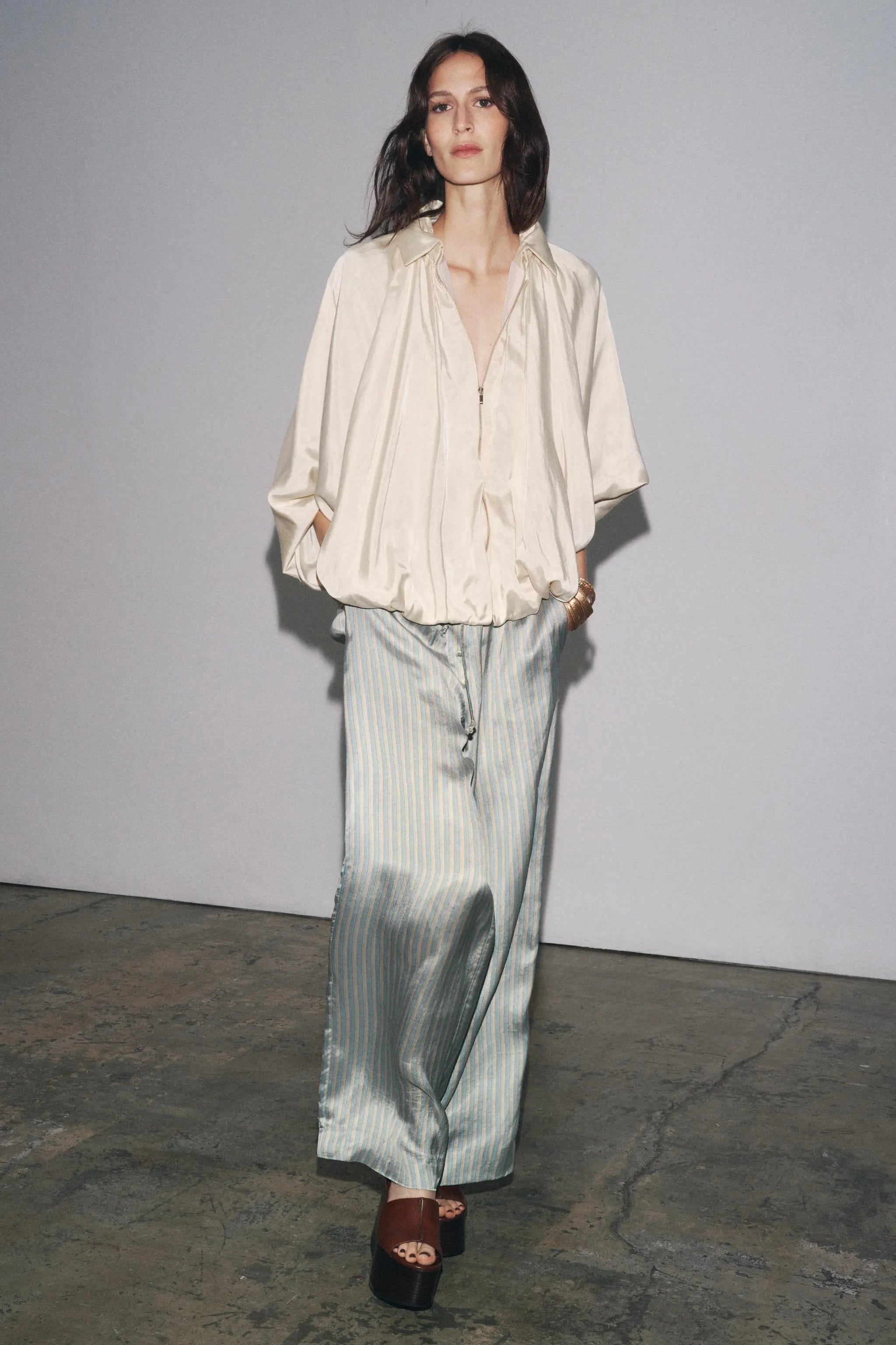 Bomber jacket made of lyocell yarn. Featuring a lapel collar, long puffed sleeves, a gathered hem and zip-up fron